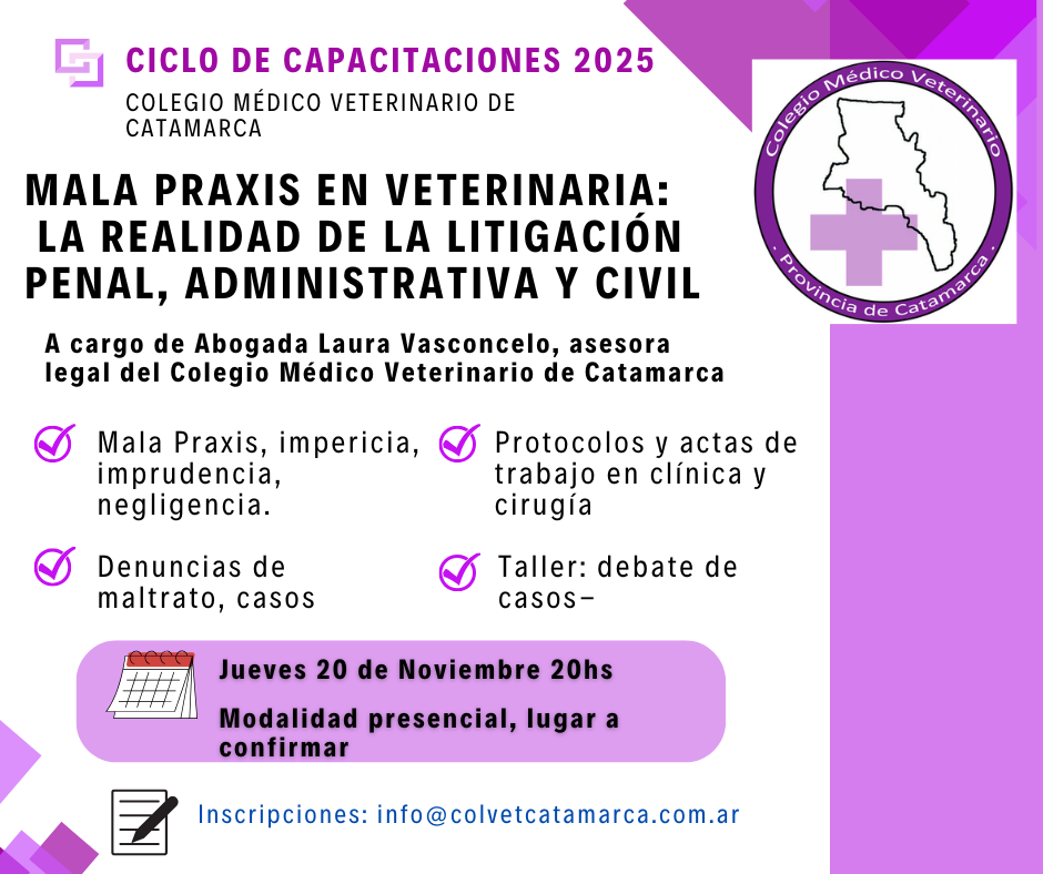 El próximo jueves 20 de noviembre se llevará a cabo la disertación a cargo de la asesora legal del Colegio Médico Veterinario de Catamarca, Abogada Laura Vasconcelo. Allí se debatirán acerca de la realidad de la litigación penal, administrativa y civil y se trataran casos puntuales para acercar a los colegas la mayor información posible.